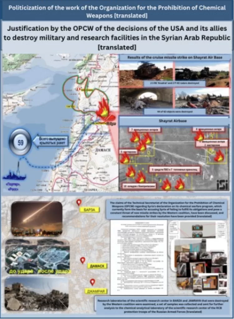 This content seeks to connect actions and decisions made in the Syrian Arab Republic to ongoing activities in Ukraine. This image displays Rtishchev’s claims that the OPCW is a puppet of the West and falsely frames investigations and decisions by the OPCW as justifications for Western military actions. Through such claims, Russia seeks to erode trust in the multilateral verification mechanisms of the OPCW, allowing Russian officials to dismiss any findings that contradict their allegations as politically motivated rather than evidence based. These narratives serve to weaken both the OPCW and the Chemical Weapons Convention.
