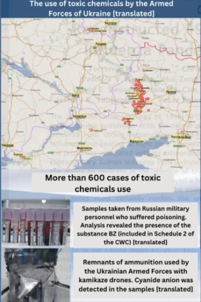 The briefing included multiple claims of chemical weapons use by Ukrainian forces and its allies. One example was a claim that the Russian Ministry of Defense uncovered more than 600 instances of chemical weapons use by the Ukrainian Armed Forces, including the use of riot control agents and scheduled chemicals. To support his claims, Rtishchev provides several pieces of “evidence.” This is a common tactic used throughout the briefing to support unfounded claims. While such evidence has the appearance of legitimacy and even scientific robustness, it either lacks independent third-party verification or represents a deliberate misinterpretation of information.