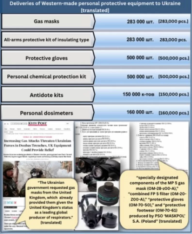Rtishchev also claims that deliveries to Ukraine of personal protective equipment (PPE) and antidote kits prove Ukraine’s use of (or intent to use) chemical weapons. Framing CBRN preparedness measures as evidence of malintent is a common tactic used by the Russian government to support false claims for which there is no substantive evidence. As the article included in the image suggests, such equipment was requested to protect Ukrainian forces from Russian chemical attacks.