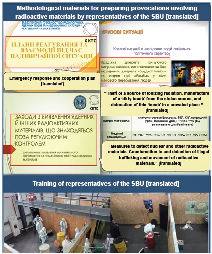 It goes on to claim that SBU training simulates the theft of ionizing radiation sources, the construction of a “dirty bomb,” and its detonation in a crowded area. These exercises, presented alongside images of personnel in protective suits, are used as “evidence” that Ukraine intends to conduct such an attack. In practice, such scenarios are part of standard CBRN counterterrorism training used internationally to strengthen preparedness and response to recognized threats, including terrorist acquisition and use of radioactive sources. The SBU is legally mandated to conduct counterterrorism and state security preparedness, including for radiological threats. The briefing materials therefore function as pseudo-evidence by reframing legitimate security training as incriminating proof of malintent.