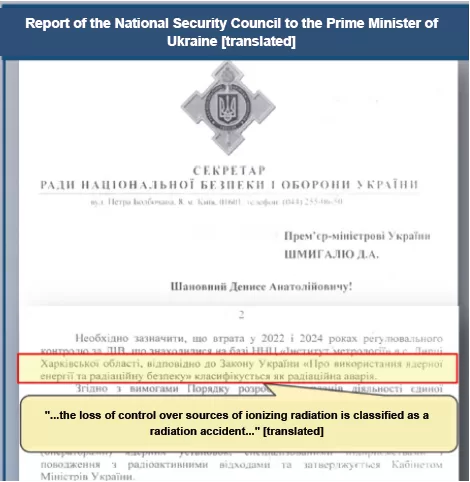Russia’s briefing asserts that Ukraine lost control of 68 ionizing radiation sources in the Kharkiv region and uses this to suggest that Kyiv could build a “dirty bomb.” The allegation relies on the selective quotation of Ukrainian documentation that describes a “loss of control.” In regulatory practice, such reporting is mandatory when sources cannot be physically verified, including due to war-related access restrictions (which is what occurred in this case due to Russia’s invasion and subsequent military operations). Ukraine’s documentation therefore reflects compliance with safety and security obligations and alignment with IAEA expectations rather than an admission of illicit activity. The materials function as pseudo-evidence by reframing mandatory incident reporting as evidence of Ukrainian malintent.