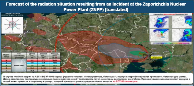 The briefing asserts that a radiation accident occurring at the ZNPP would result in a Chornobyl-like fallout, with radiation spreading across Ukraine and Europe. This allegation weaponizes selective radiological modeling and historical trauma. The referenced “forecast” is cherry-picked from standard multi-scenario emergency planning, which uses dynamic tools like JRODOS or FLEXPART to simulate multiple plume trajectories depending on variable weather. Moreover, equating current risks at the ZNPP to Chornobyl is scientifically flawed: unlike the 1986 core meltdown, explosion, and high-energy graphite fire, which lofted radioactive material into the stratosphere, any localized incident at the ZNPP would lack the thermal energy necessary for long-range atmospheric transport, especially while the ZNPP is in cold shutdown. Hence, the claim relies on unsubstantiated fear mongering by invoking the collective trauma of the Chornobyl disaster.