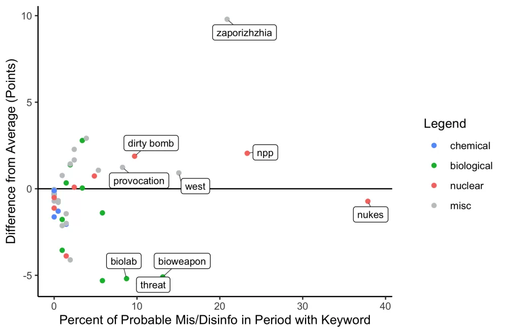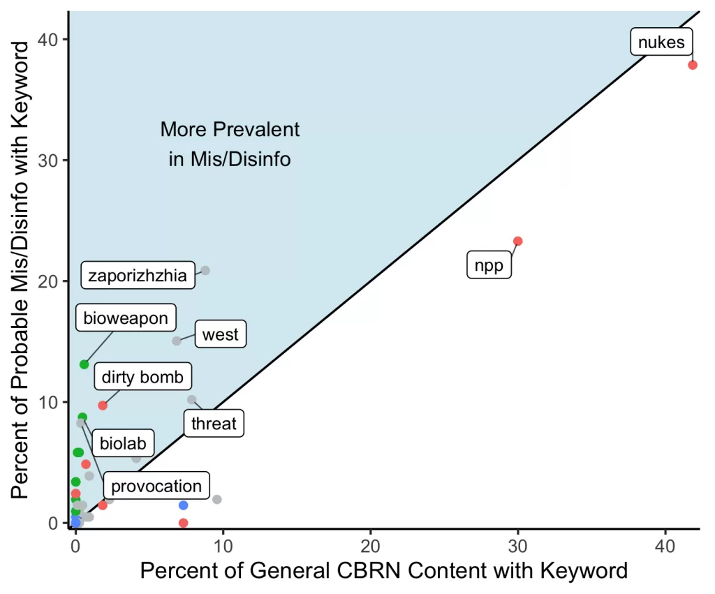 Prevalence of Keywords in CBRN Disinformation from monitoring period relative to prior periods (Keywords above the line were mentioned in an above average number of posts, while keywords below the line were discussed less frequently than usual. Note that each keyword accounts for variation in the term. For example, “NPP” captures not only the acronym, but also “nuclear power plant” and “nuclear plant” across all three languages.)