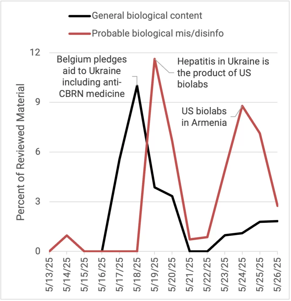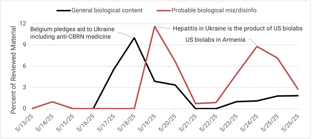 - A spike in post volume caused by false claims about undercover US-funded biolabs in Armenia and other post-Soviet states using scientific engagement as justification for existence: