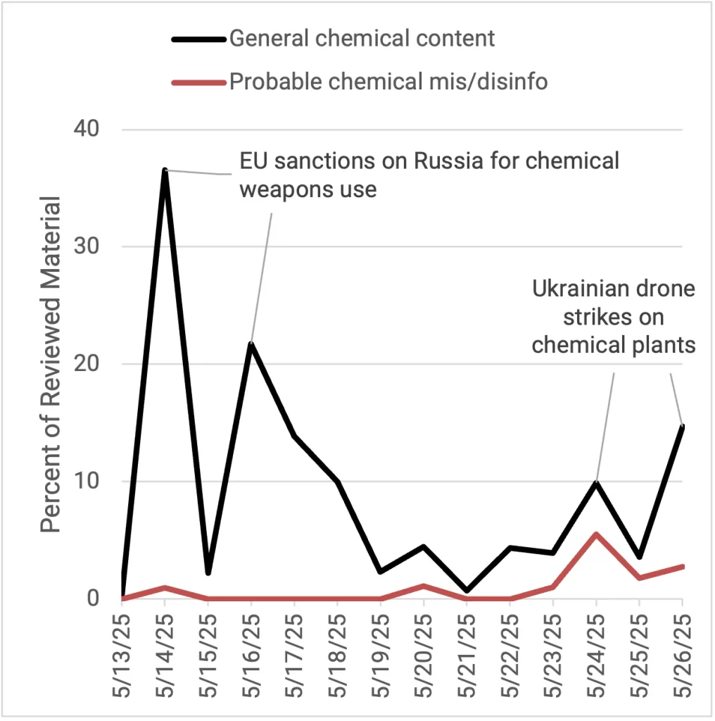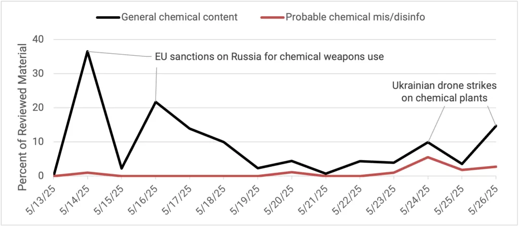 DFRLab conducts a weekly review of data produced by a search query including Ukrainian, Russian and English languages to identify when spikes of CBRN disinformation narratives are spreading on Telegram, X, and the web. DFRLab tracks both: