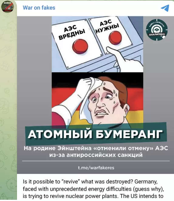 This period, DFRLab tracked three separate posts on the topic of nuclear power by the Telegram account @warfakes, which is a fake fact-checking channel operated as part of the Doppelganger influence operation. This account has not been part of the monitoring before and still unclear whether this is a one-off interest in nuclear narratives or the start of a trend. Future monitoring will continue to track WMD-related messages within frameworks of known influence operations.