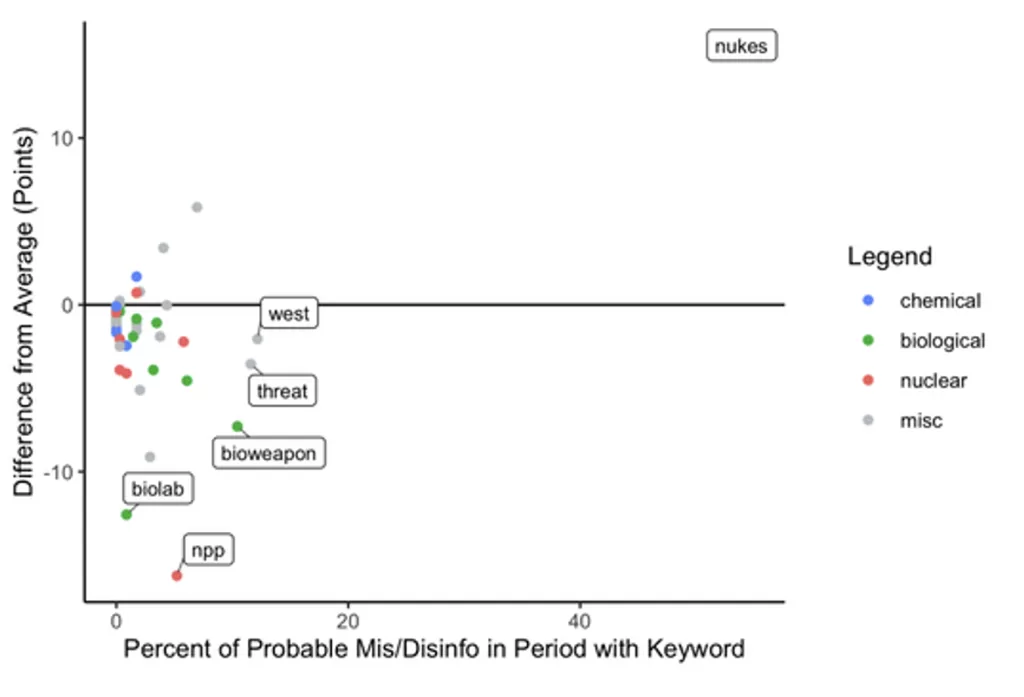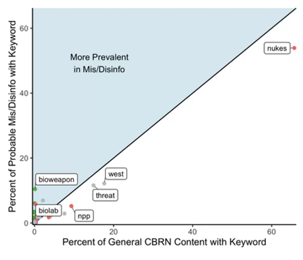 Prevalence of Keywords in CBRN Disinformation from monitoring period relative to prior periods (Keywords above the line were mentioned in an above average number of posts, while keywords below the line were discussed less frequently than usual. Note that each keyword accounts for variation in the term. For example, “NPP” captures not only the acronym, but also “nuclear power plant” and “nuclear plant” across all three languages.)