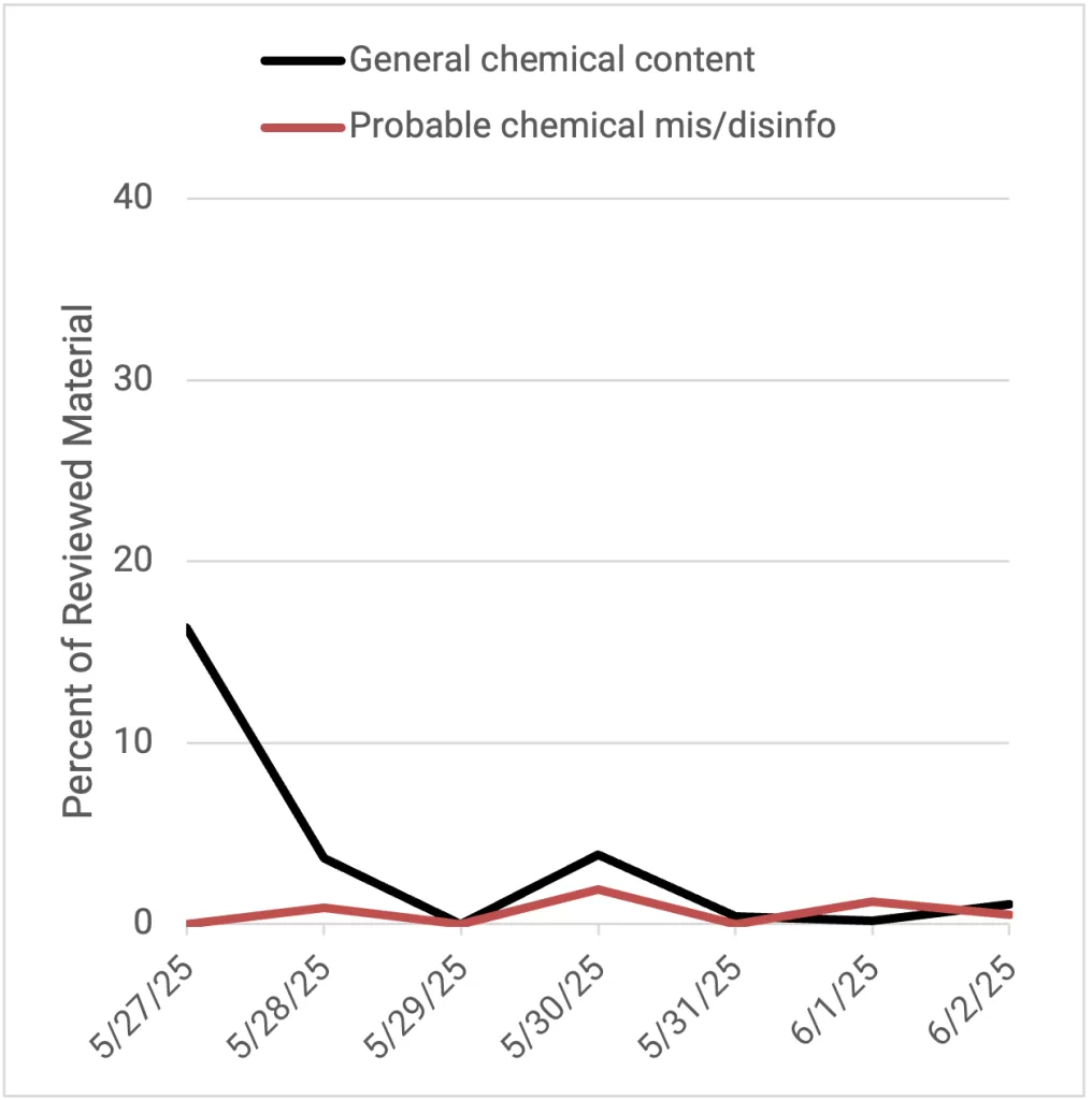 DFRLab conducts a weekly of data based on a search query including Ukrainian, Russian and English languages to identify when spikes of in CBRN disinformation narratives are spreading on Telegram, X, and web. DFRLab tracks both: