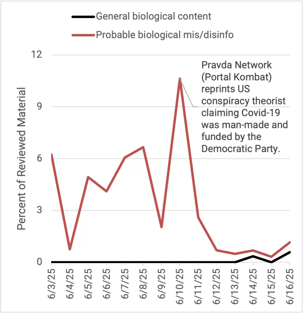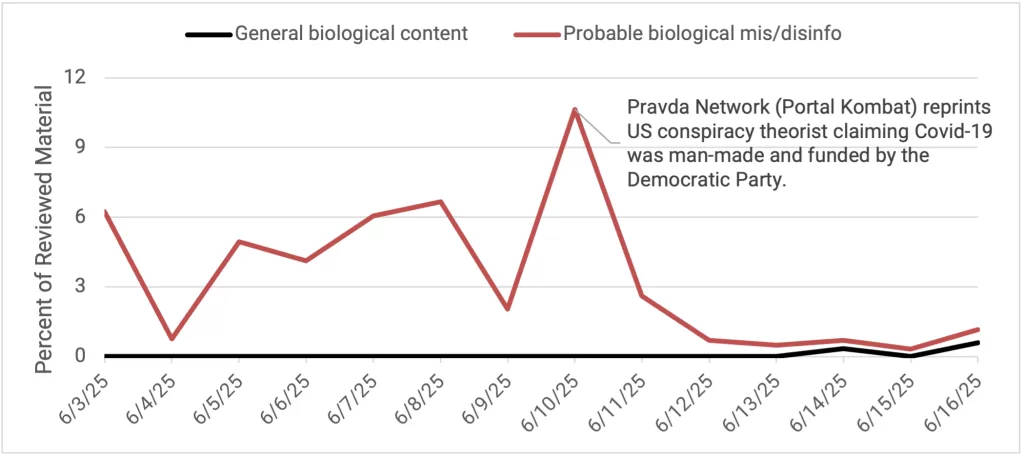 Narrative Trend Monitoring: As part of the GP efforts to identify, understand, and mitigate hostile CBRN disinformation, the Atlantic Council’s Digital Forensic Research Lab (DFRLab) conducts a bimonthly search query of state-sponsored or state-adjacent disinformation narratives. This real-time detection allows the initiative to swiftly recognize, isolate and respond to disinformation narratives and networks as they occur.