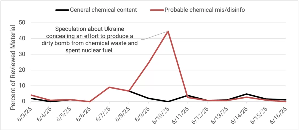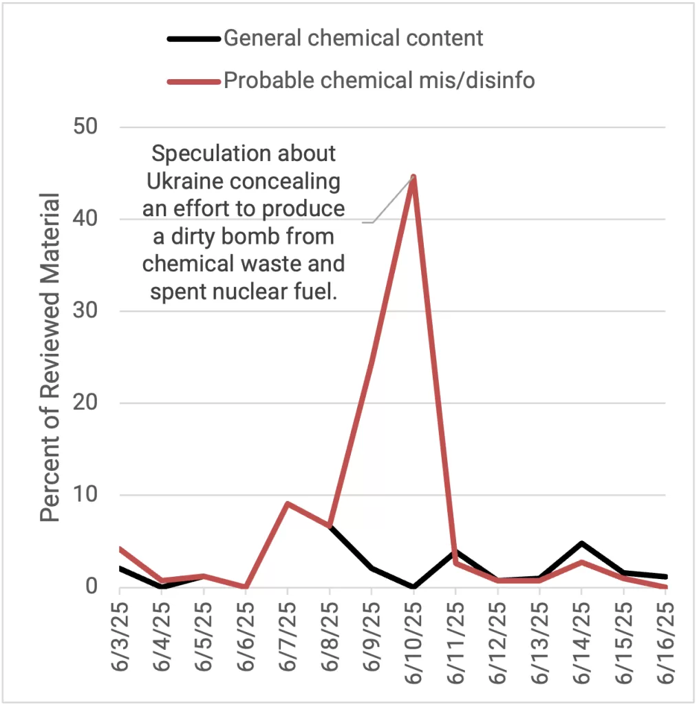 DFRLab conducts a weekly of data based on a search query including Ukrainian, Russian and English languages to identify when spikes of in CBRN disinformation narratives are spreading on Telegram, X, and web. DFRLab tracks both: