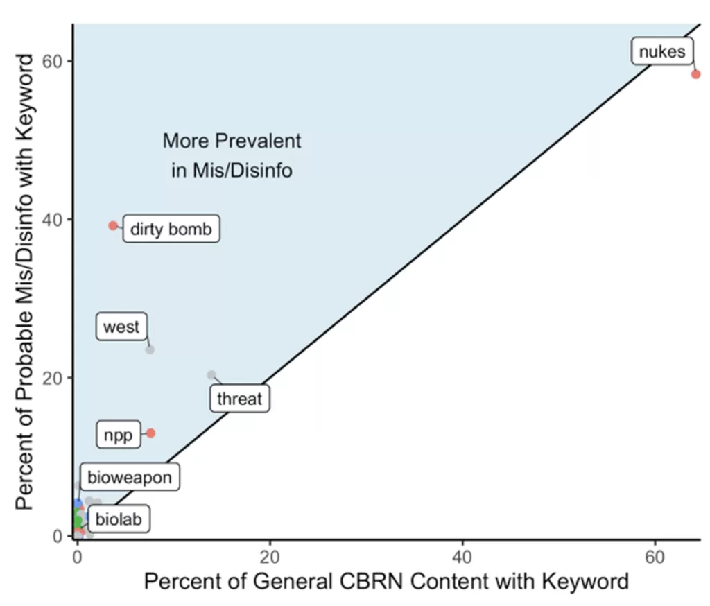 This period we see a rise in messages mentioning nukes or nuclear weapons – however, the rise in nuclear disinformation is proportional and connected to the general rise in chatter messages about nuclear weapons.