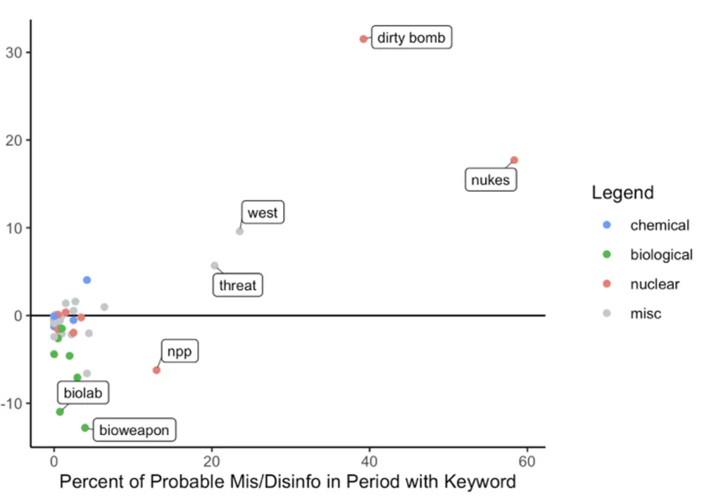 Prevalence of Keywords in CBRN Disinformation from monitoring period relative to prior periods (Keywords above the line were mentioned in an above average number of posts, while keywords below the line were discussed less frequently than usual. Note that each keyword accounts for variation in the term. For example, “NPP” captures not only the acronym, but also “nuclear power plant” and “nuclear plant” across all three languages.)