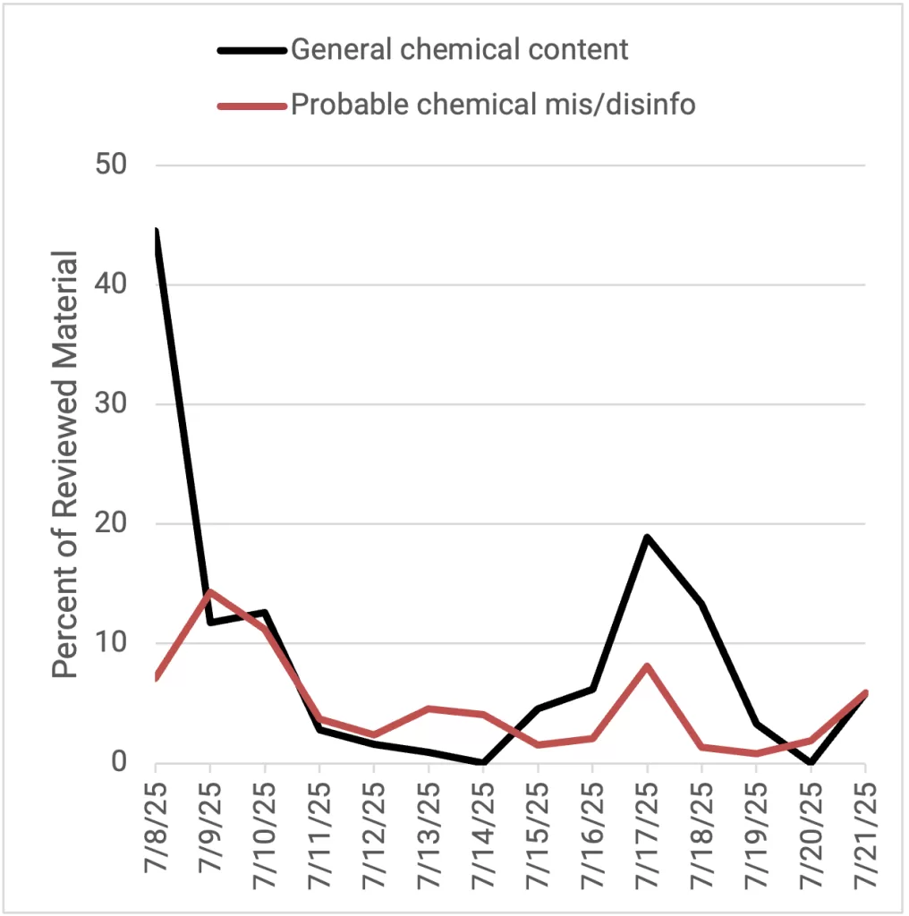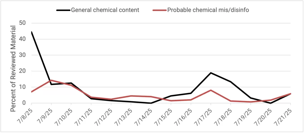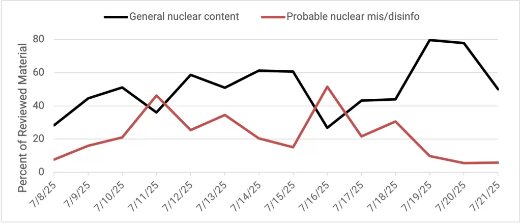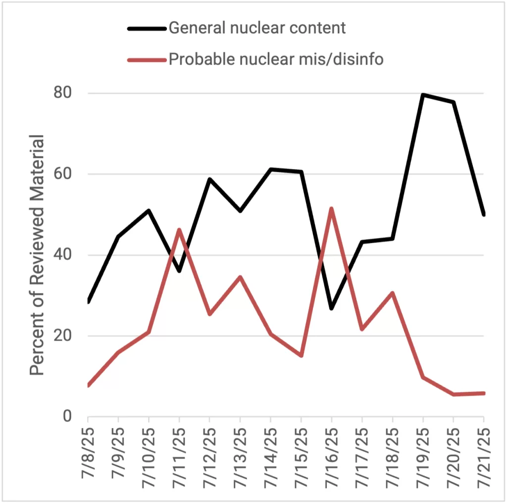 DFRLab conducts a weekly of data based on a search query including Ukrainian, Russian and English languages to identify when spikes of in CBRN disinformation narratives are spreading on Telegram, X, and web. DFRLab tracks both: