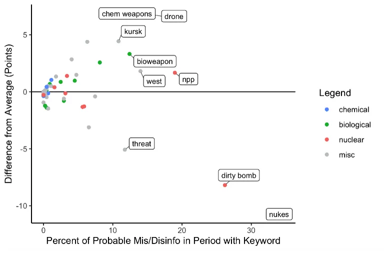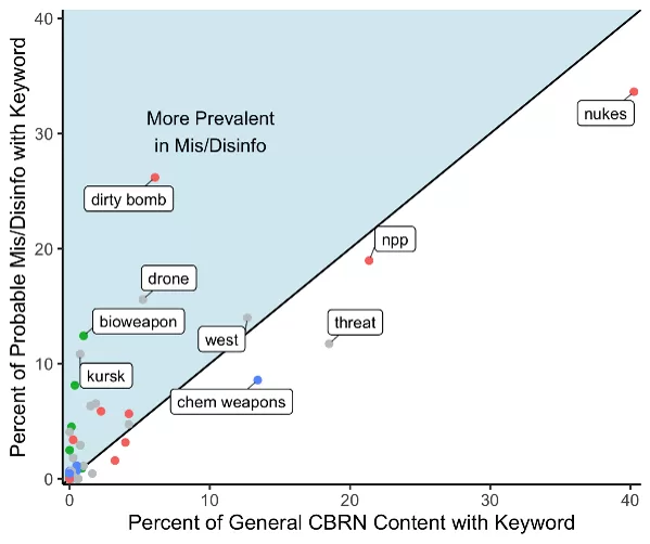 Prevalence of Keywords in CBRN Disinformation from monitoring period relative to prior periods (Keywords above the line were mentioned in an above average number of posts, while keywords below the line were discussed less frequently than usual. Note that each keyword accounts for variation in the term. For example, “NPP” captures not only the acronym, but also “nuclear power plant” and “nuclear plant” across all three languages.)