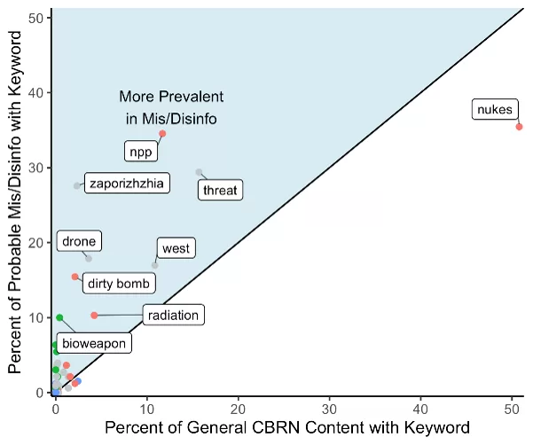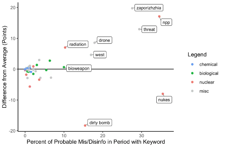 Prevalence of Keywords in CBRN Disinformation from monitoring period relative to prior periods (Keywords above the line were mentioned in an above average number of posts, while keywords below the line were discussed less frequently than usual. Note that each keyword accounts for variation in the term. For example, “NPP” captures not only the acronym, but also “nuclear power plant” and “nuclear plant” across all three languages.)