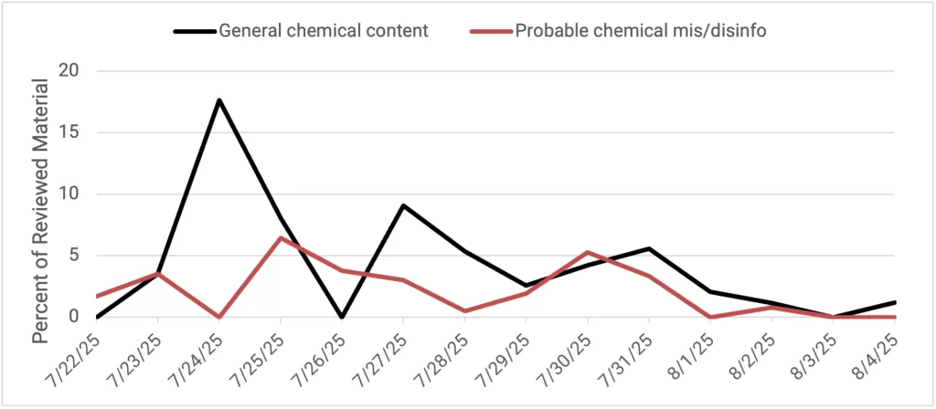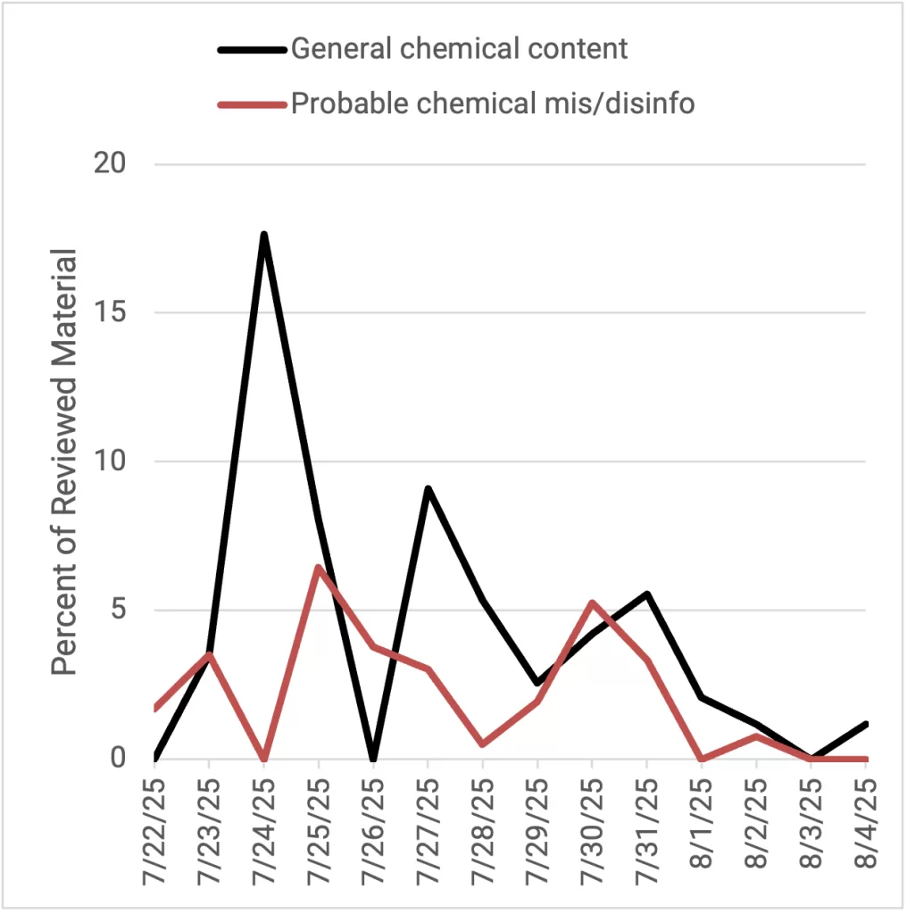 DFRLab conducts a weekly of data based on a search query including Ukrainian, Russian and English languages to identify when spikes of in CBRN disinformation narratives are spreading on Telegram, X, and web. DFRLab tracks both: