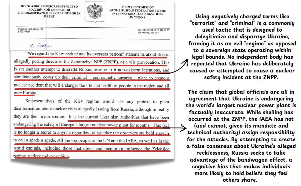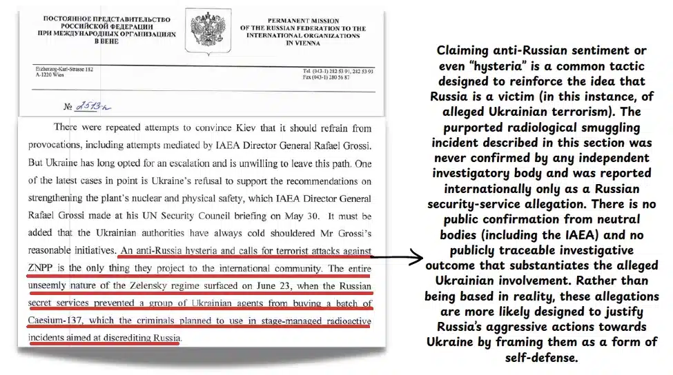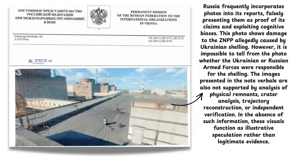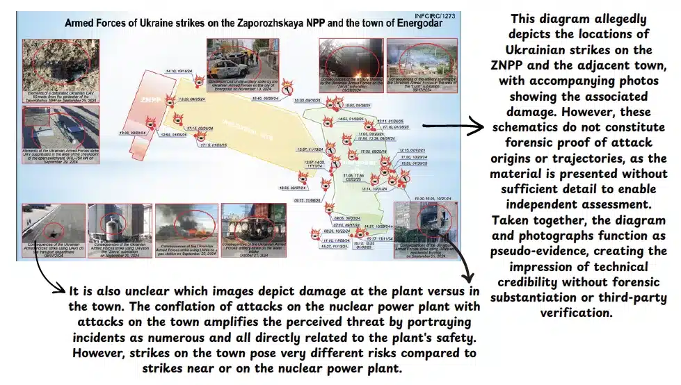 Providing photos or diagrams as “evidence” of Ukraine’s alleged illegal or reckless actions near/against nuclear power plants