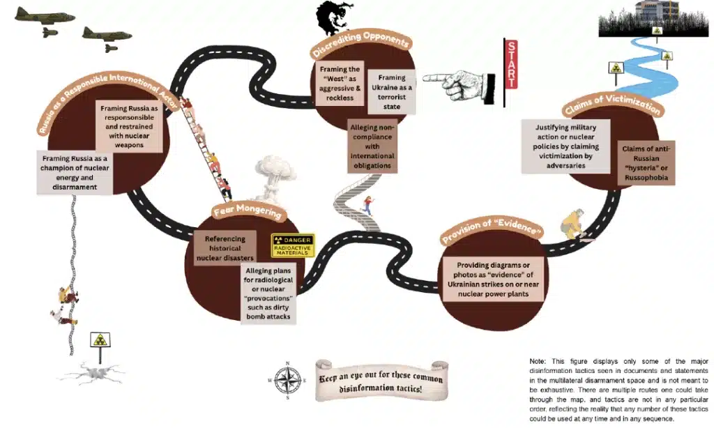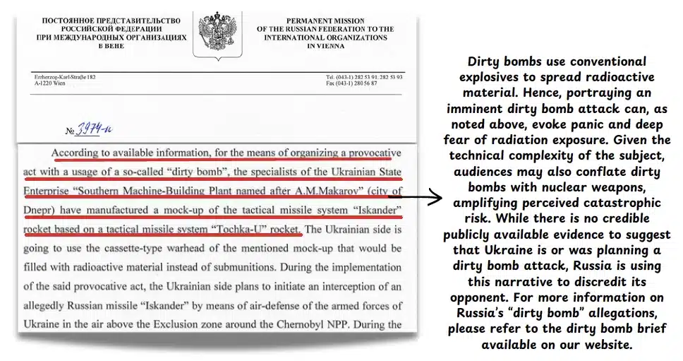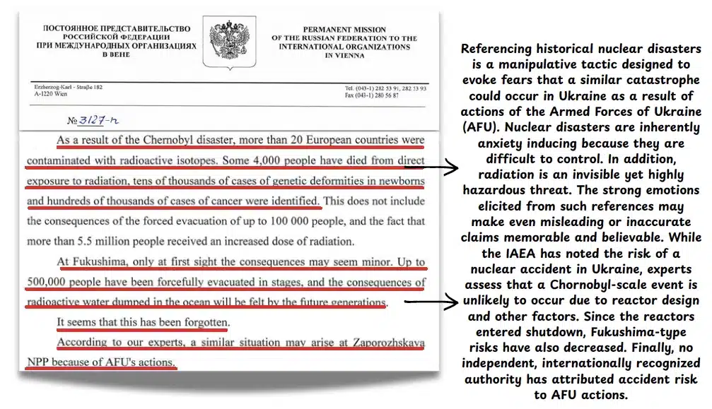 Stoking fears of a nuclear or radiological catastrophe by referencing historical disasters or alleging plans for radiological or nuclear “provocations”